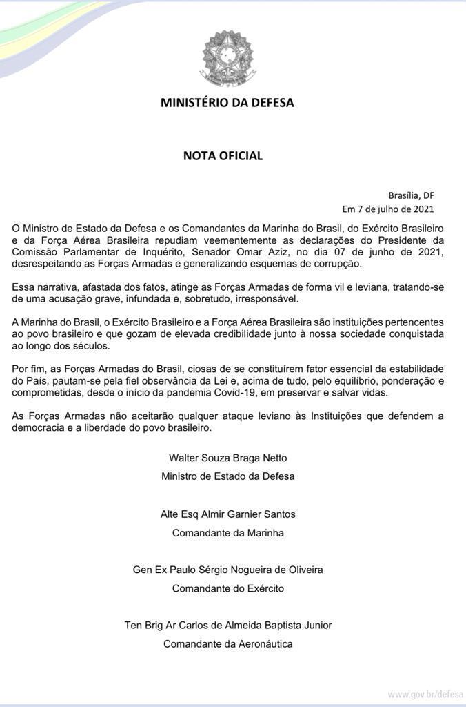 Abaixo a nota do Ministério da Defesa e dos comandantes militares: