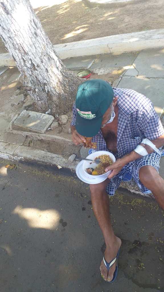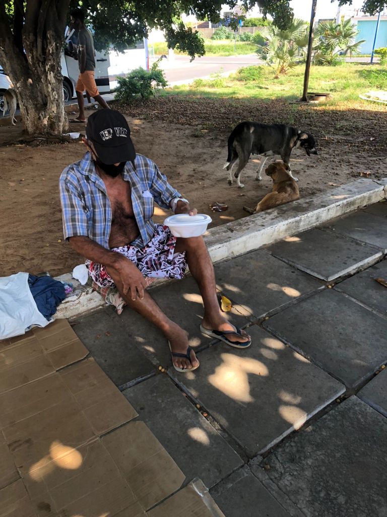 Os pacientes já fragilizados em razão do procedimento de hemodiálise sentam-se na calçada e no meio fio, em meio a animais e ali mesmo fazem suas refeições.