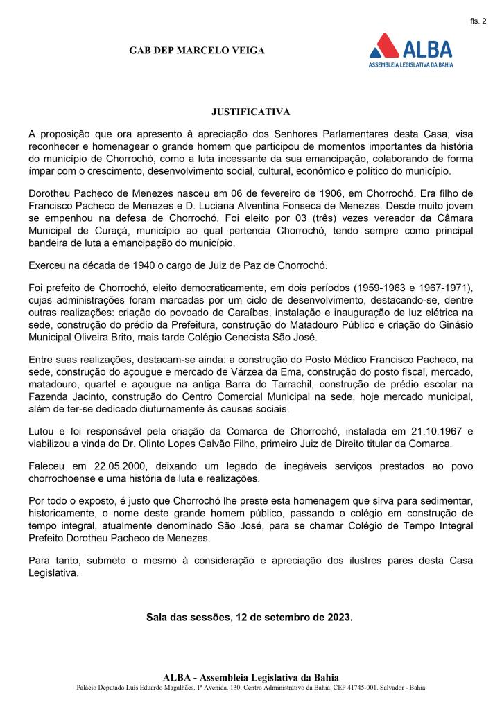 O projeto cuida de denominar Colégio de Tempo Integral Prefeito Dorotheu Pacheco de Menezes a uma nova escola ora em construção em Chorrochó. Como o novo prédio, a princípio, vai abrigar o Colégio Estadual São José, na prática dar-se-á a mudança de nome do São José, embora o projeto não fale em mudança de nome.