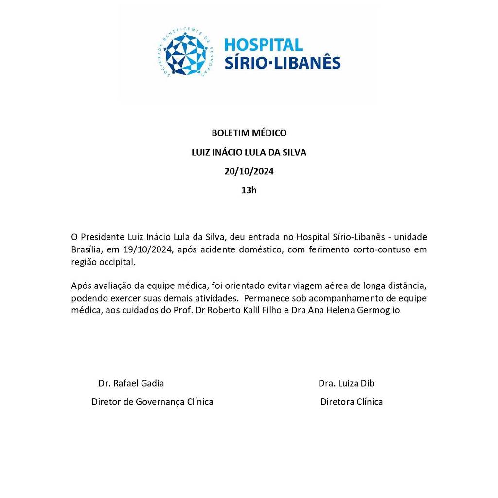 O presidente Lula da Silva, de 78 anos, sofreu uma queda em casa e foi prontamente atendido pelos médicos. Seu estado de saúde não parece preocupante, conforme demonstrado no boletim médico divulgado pelo Hospital Sírio Libanês.