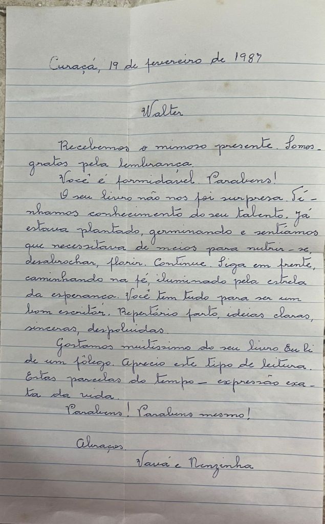 Guardo, com carinho e gratidão, a carta de 19/02/1987. D. Nenzinha e Vavá diziam, quase que em estímulo à caminhada deste modesto peregrino das letras e dos sonhos: “Continue. Siga em frente, caminhando na fé, iluminado pela estrela da esperança”.