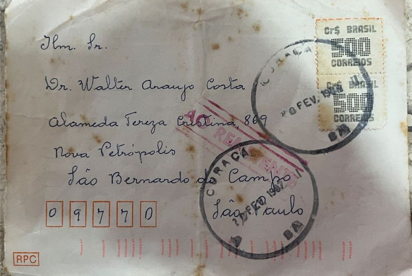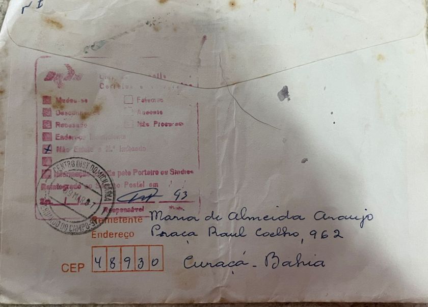 Guardo a carta e o envelope, ambos amarelados pelo tempo. Remetente: Maria de Almeida Araújo.