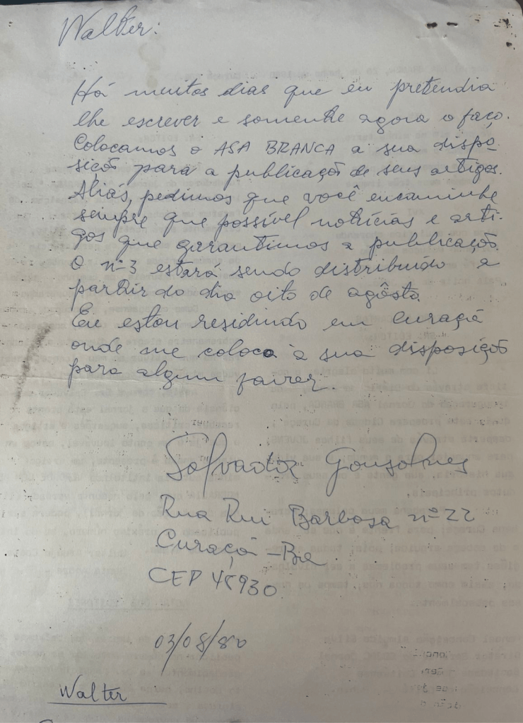 Considerando, ademais, que o documento faz parte da história de Curaçá e nada há nele de confidencial, faço-o público sem a permissão do missivista Salvador Lopes Gonsalves de quem espero a compreensão.